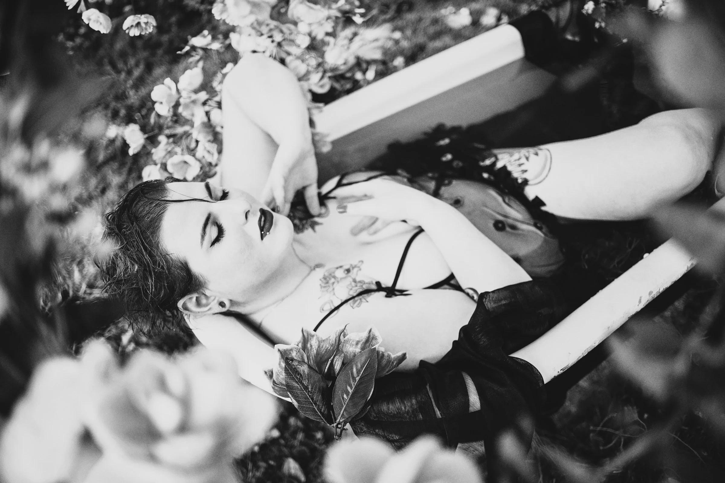 This week, our spotlight is on Nova. In this set of spellbinding images, she exudes confidence and elegance in her sheer flower dress, paired with a favorite lipstick that makes her feel beautiful. The photos capture the essence of old-school glamour, with Nova as the captivating center of attention. You’d never know that behind the scenes, we were two silly gooses playing in the bathtub, creating unforgettable memories. A tip that Nova embodies exceptionally well is to include elements that bring your favorite self to the table. It’s normal to bring nerves to a boudoir session, but we should also bring props, makeup, accessories, or an outfit that connects you to a positive perception of yourself. Here, Nova chose to pair a daring outfit with “OMG, I feel so good in this lipstick” and it worked perfectly!